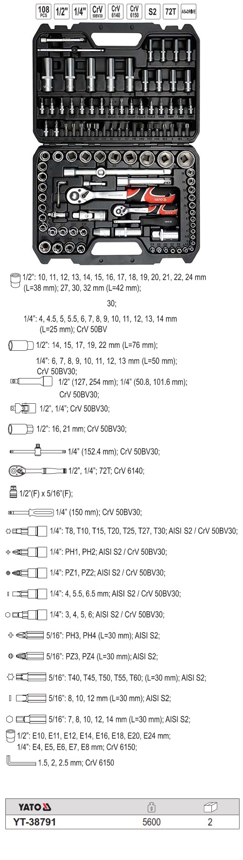 1/4" & 1/2" 108 Cái Bộ Dụng Cụ Sửa Chữa YT-38791 (10-32mm)
