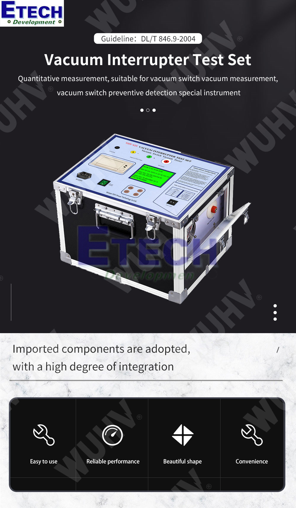 | Đặc điểm nổi bật | - Đo nhanh trong 30 giây - Không cần tháo ống tia lửa - Tự động phán đoán mức độ chân không (Tốt / Cảnh báo / Hỏng) - Lưu 1000 kết quả, in trực tiếp, xuất USB - Hoạt động ổn định tại trạm 500kV |
