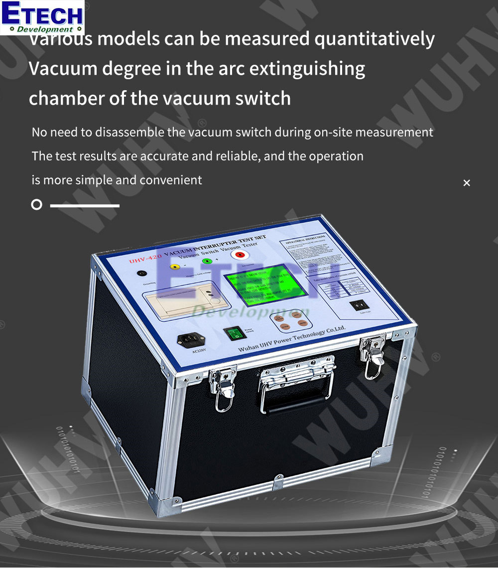 Bộ kiểm tra chân không UHV-420 Vacuum Interrupter Test Set sử dụng một cuộn kích từ mới để đo độ chân không của buồng dập hồ quang bằng phương pháp phóng điện magnetron mà không cần tháo rời buồng dập hồ quang. Đồng thời, bộ vi xử lý được sử dụng để điều khiển đồng bộ, thu thập và xử lý dữ liệu, giúp cho độ nhạy kiểm tra hiện trường buồng chân không của buồng dập hồ quang đạt tới mức 10-5Pa.