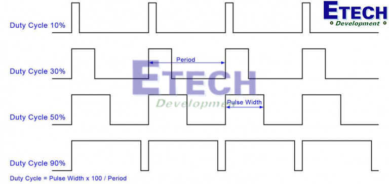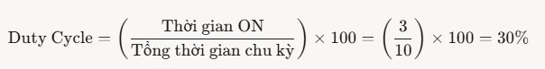 Chu kỳ nhiệm vụ là tỷ lệ giữa thời gian tín hiệu ở mức cao ON và tổng thời gian của một chu kỳ tín hiệu bao gồm cả thời gian ON và OFF, được biểu thị dưới dạng phần trăm. Ví dụ, nếu một tín hiệu PWM có thời gian ON là 2ms và tổng thời gian chu kỳ là 10ms, chu kỳ nhiệm vụ sẽ là: