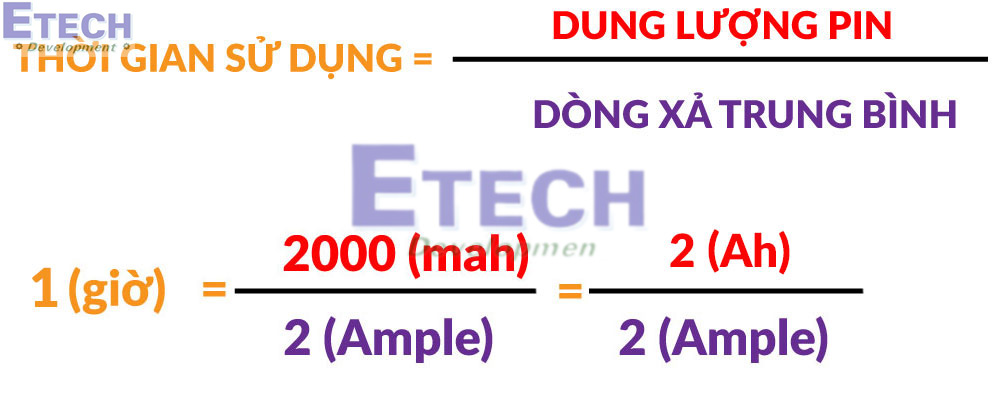 Ví dụ: Với pin 18650 có dung lượng 2000mAh, nếu xả dòng điện 2A, pin sẽ cạn sau 1 giờ, theo công thức sau: