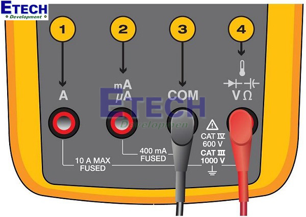 - Cổng COM (Common): Luôn cắm que đo màu đen vào cổng này, còn được gọi là cổng nối đất, để kết nối với cực âm của mạch.