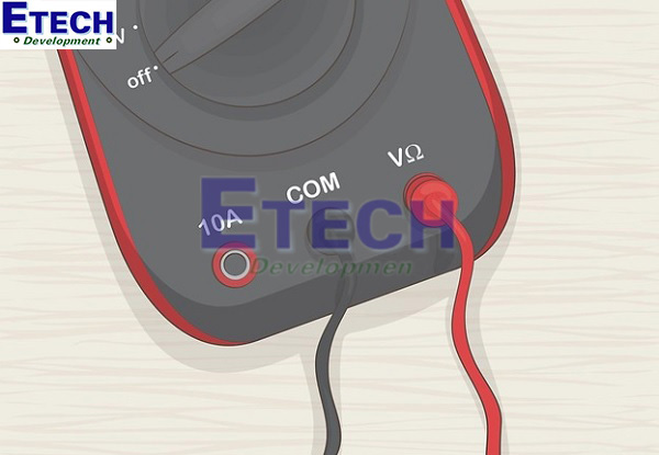 Bước 2: Cắm hai dây đo vào đồng hồ. Dây đen cắm vào cổng COM (cực âm), dây đỏ cắm vào cổng "VΩ" (cực dương).