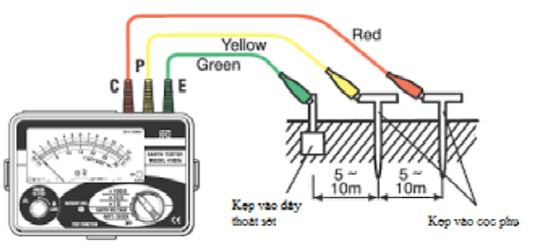 Để thực hiện đo, chúng ta đóng các cọc tiếp đất phụ P và C vào lòng đất sâu. Khoảng cách giữa chúng và thiết bị nối đất đang được thử nghiệm là khoảng 5-10m. Để kết nối, ta sử dụng dây màu xanh lá cây với thiết bị nối đất, dây màu vàng với cọc tiếp đất phụ P và dây màu đỏ với cọc tiếp đất phụ C, theo thứ tự các đầu nối E, P và C của thiết bị.