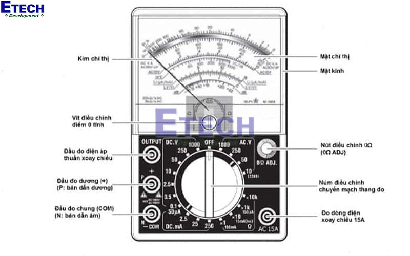 Cấu trúc bên ngoài: Đồng hồ vạn năng bao gồm các bộ phận chính như kim chỉ thị, đầu đo dương (P) hoặc bán dẫn dương, đầu đo chung (Com) hoặc bán dẫn âm (N), cung chia độ, vít điều chỉnh điểm 0 tĩnh, đầu đo điện áp xoay chiều, vỏ trước và sau, mặt chỉ thị, mặt kính, nút điều chỉnh 0Ω (0Ω ADJ), chuyển mạch chọn thang đo, và đầu đo dòng điện xoay chiều.