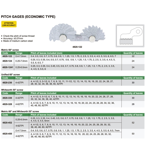 Bao gồm : 0.4, 0.5, 0.6, 0.7, 0.75, 0.8, 0.9, 1, 1.25 , 1.5 , 1.75 , 2, 2.25, 3 , 3.5 , 4 , 4.5, 5 , 5.5, 6 , 6.5, 7mm