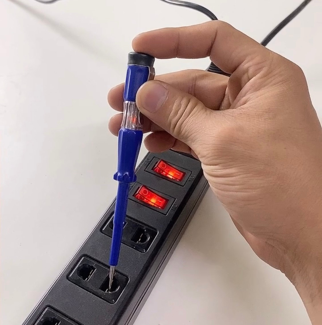 Sử dụng bút kiểm tra điện để đánh giá an toàn của đường dây điện xoay chiều, quy trình này hoạt động dựa trên nguyên lý phát hiện dòng điện: Khi tiếp xúc vào một trong hai chấu của ổ cắm, nếu là dây pha (dây nóng), bút kiểm tra sẽ kích hoạt và đèn LED bên trong sẽ sáng lên, báo hiệu sự hiện diện của điện. Trái lại, nếu tiếp xúc với dây trung hòa, đèn sẽ không sáng vì dây này không dẫn điện.