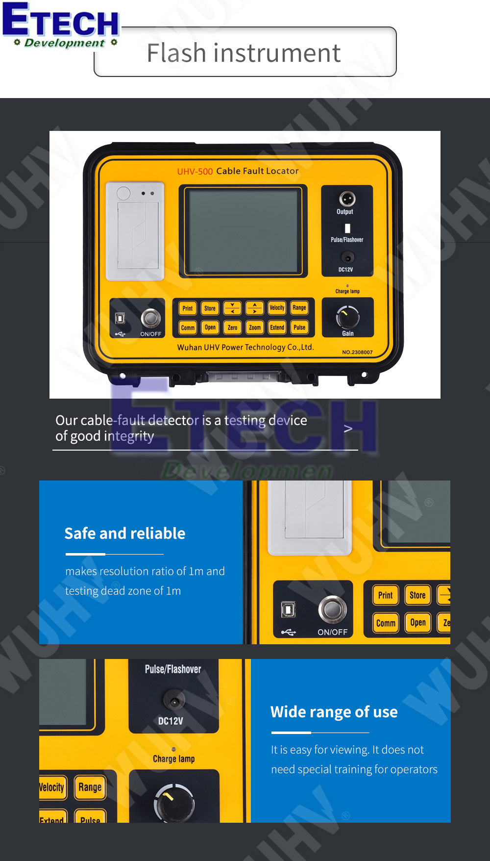 Hệ thống UHV-500 bao gồm ba bộ phận chính: bộ phát xung, bộ dò tuyến và bộ định vị chính xác. Máy có khả năng phát hiện nhiều dạng sự cố cáp như: điện trở thấp, điện trở cao, ngắn mạch, đứt mạch, rò điện và phóng điện đánh thủng; đồng thời xác định chính xác vị trí sự cố, chiều dài cáp, tuyến đi và độ sâu cáp ngầm.