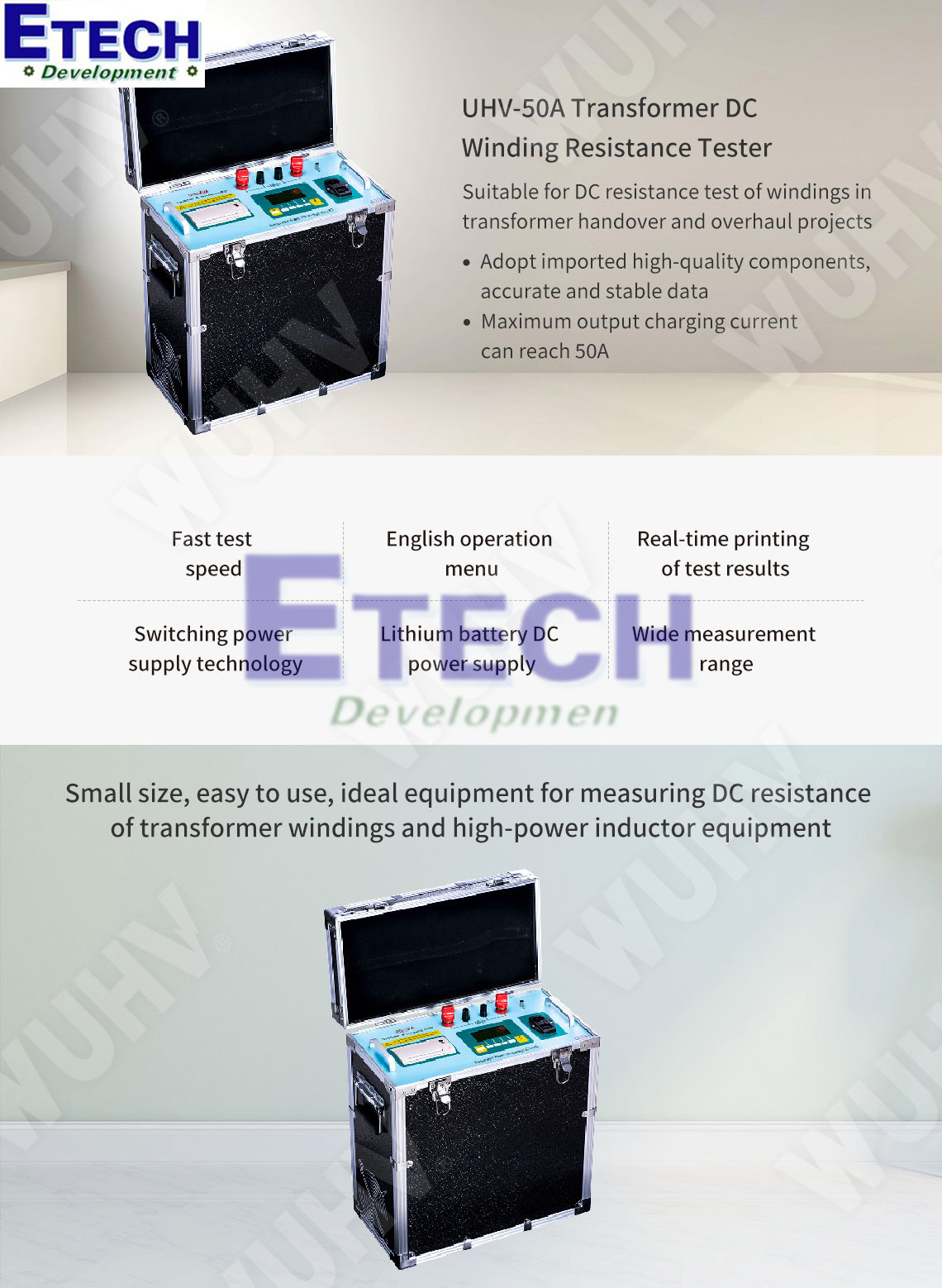 UHV-50A không đơn thuần là một máy đo mà đó là đỉnh cao của công nghệ thử nghiệm máy biến áp. Với dòng đo 50A mạnh mẽ, độ chính xác vượt trội và tốc độ đo đột phá thiết lập lên một tiêu chuẩn mới về hiệu suất và độ tin cậy, xứng đáng là sự lựa chọn tối ưu cho các tổ chức đòi hỏi giải pháp kỹ thuật đỉnh cao. Mọi chi tiết về máy đo điện trở cuộn dây máy biến áp UHV-50A Transformer DC Winding Resistance Tester xin vui lòng liên hệ trực tiếp Etech Việt Nam để được tư vấn chi tiết.