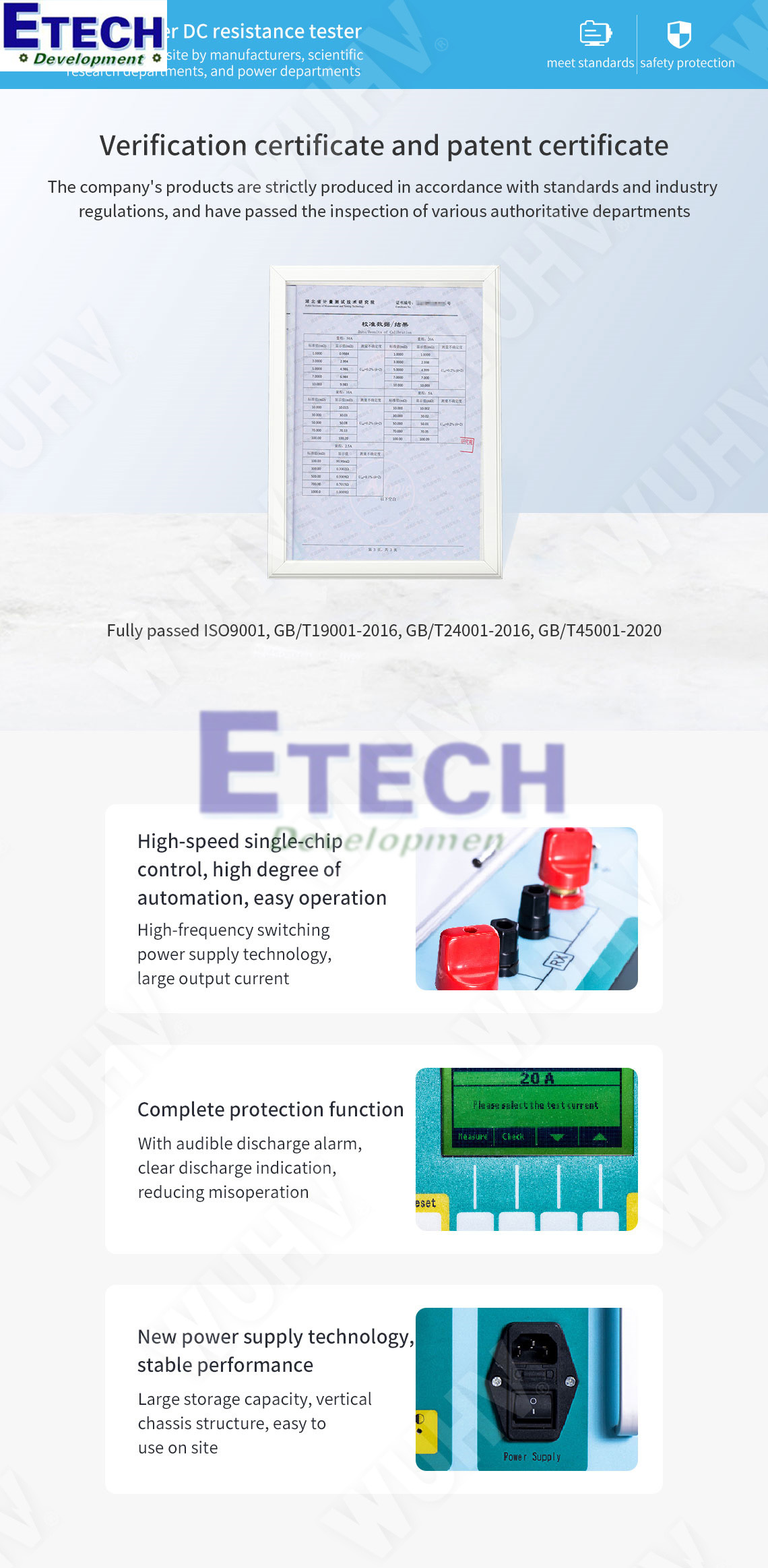 Máy đo điện trở một chiều đáp ứng các yêu cầu của tiêu chuẩn DL/T 845.3-2004, phù hợp với quy định quốc gia GB6587-86 "Tổng quan chung về thử nghiệm môi trường của thiết bị đo lường điện tử" và GB6593-86 "Quy tắc thử nghiệm chất lượng thiết bị điện tử".