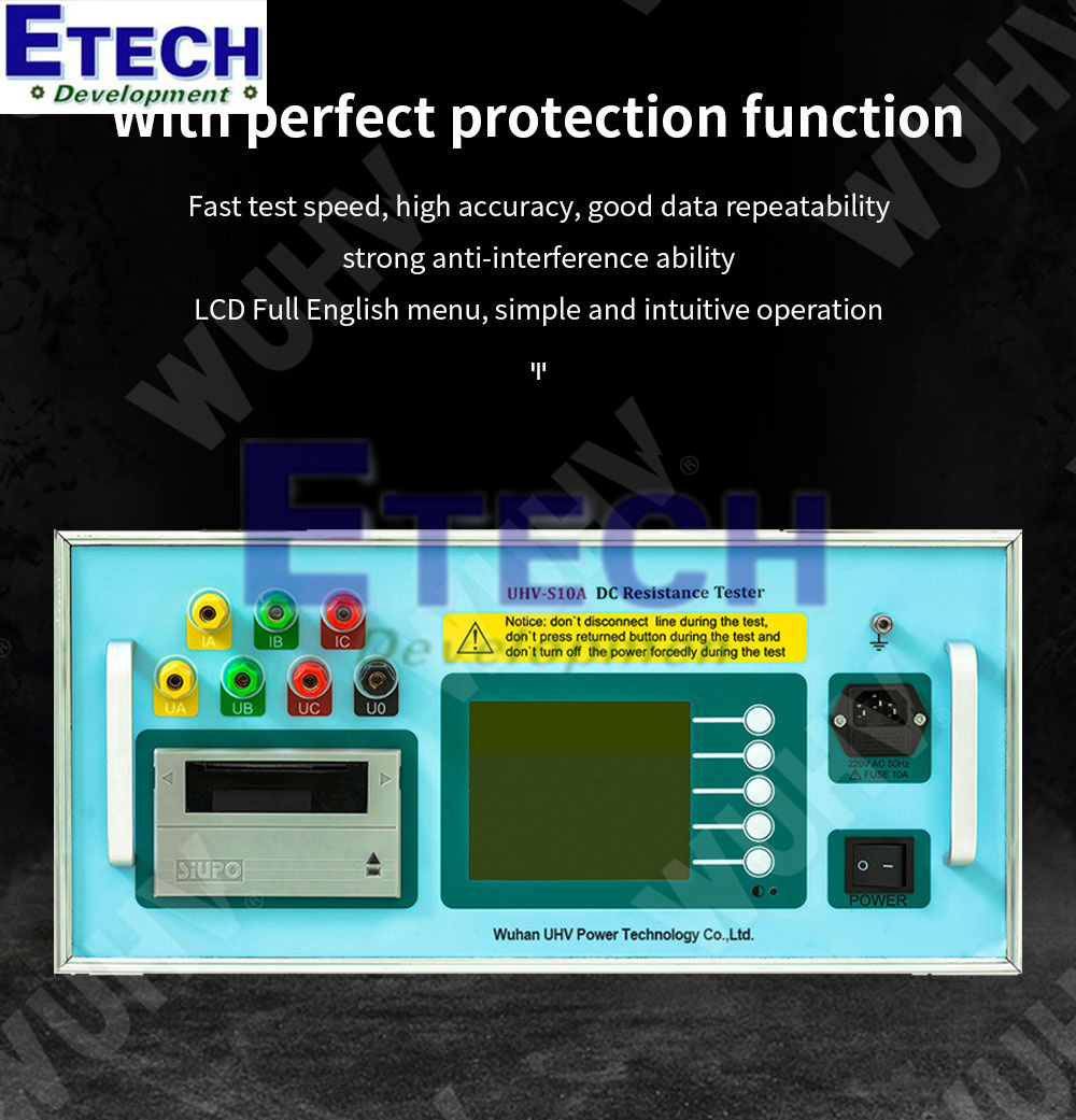 Máy đo điện trở một chiều ba mạch cho máy biến áp UHV-S10A Three-circuit Transformer DC Resistance Tester (gọi tắt là máy đo điện trở DC) là sản phẩm thế hệ mới nhất dành riêng cho đo điện trở DC của máy biến áp, được tối ưu hóa đặc biệt để đo đồng thời ba pha cuộn dây của máy biến áp dung lượng lớn.