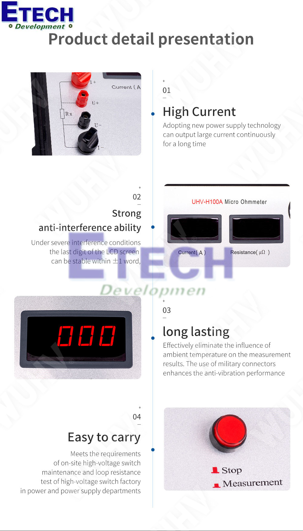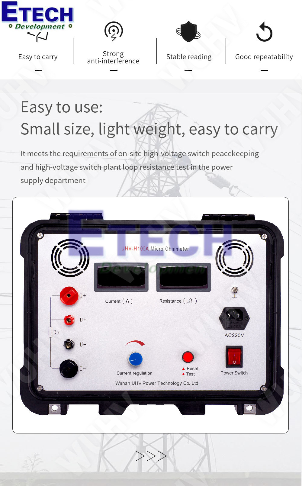 Máy đo điện trở vòng UHV-H100A do Wuhan UHV sản xuất được thiết kế hoàn toàn theo tiêu chuẩn thực hiện DL/T845.4-2004 của ngành Điện lực nước Cộng hòa Nhân dân Trung Hoa, kết hợp công nghệ nguồn điện chuyển mạch tần số cao và công nghệ mạch số tiên tiến. Thiết bị phù hợp để đo điện trở mạch của các thiết bị điều khiển đóng cắt.