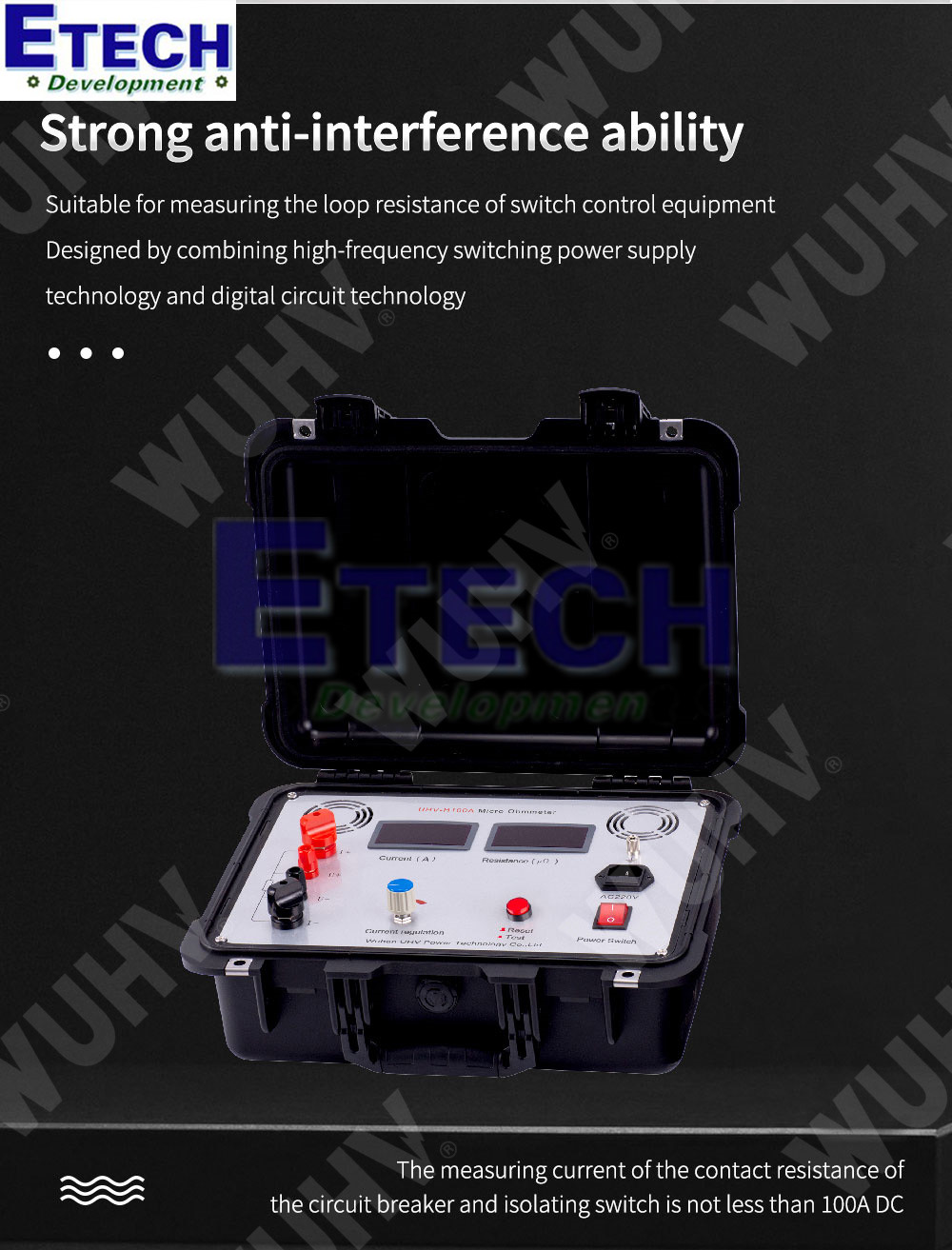Dòng thử nghiệm 100A DC đúng theo khuyến nghị của tiêu chuẩn quốc gia. Máy có thể đo trực tiếp điện trở mạch ở chế độ dòng 100A và hiển thị kết quả bằng màn hình số. Thiết bị có độ chính xác cao, hiệu suất ổn định, đáp ứng đầy đủ yêu cầu bảo trì máy cắt cao áp và kiểm tra điện trở mạch tại nhà máy sản xuất máy cắt cao áp.
