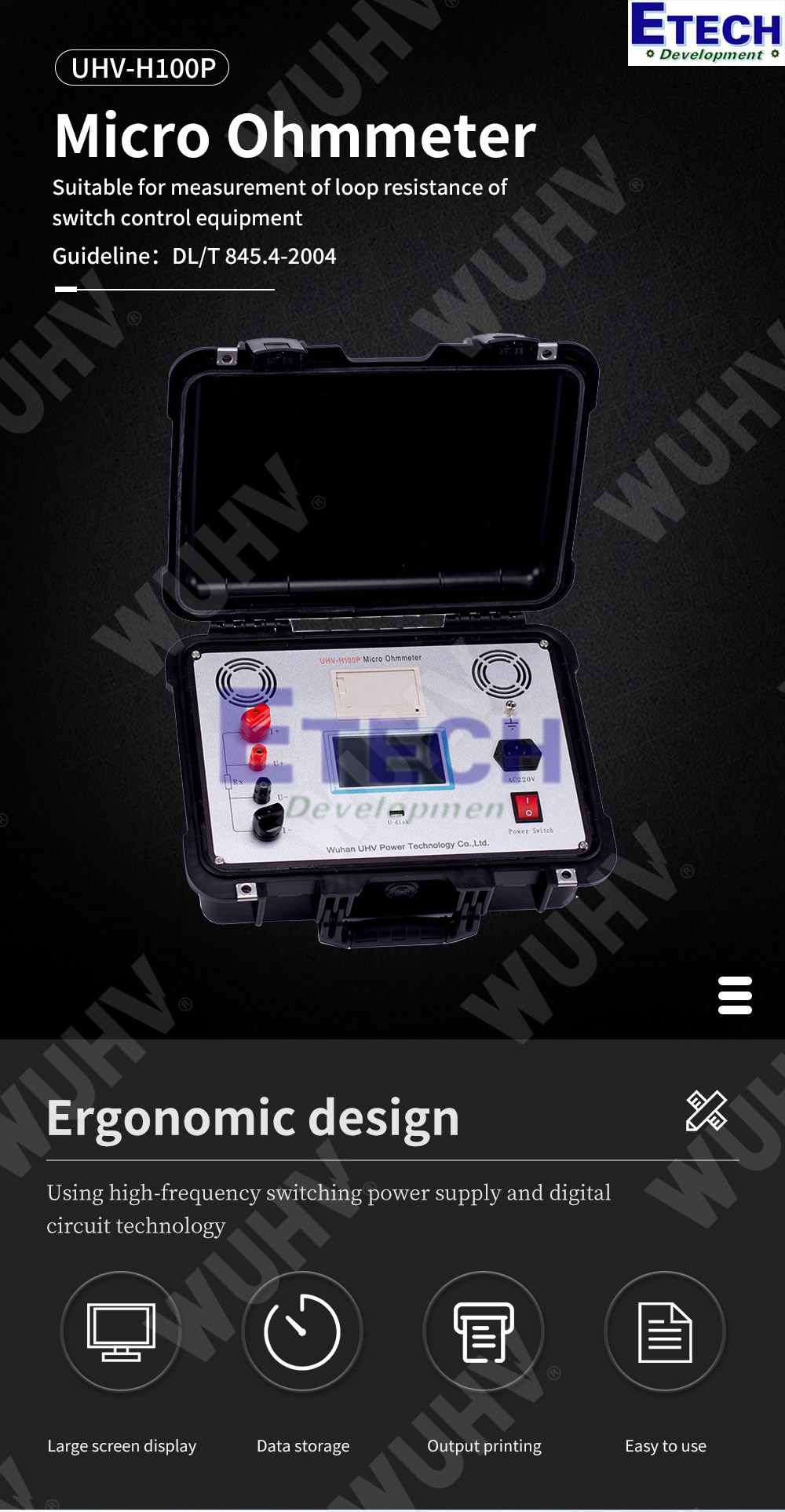 Máy đo điện trở tiếp xúc UHV-H100P được thiết kế để đáp ứng chính xác các yêu cầu kỹ thuật này. Mặt bảng điều khiển của máy được thiết kế theo nguyên tắc công thái học, phù hợp với thao tác vận hành.