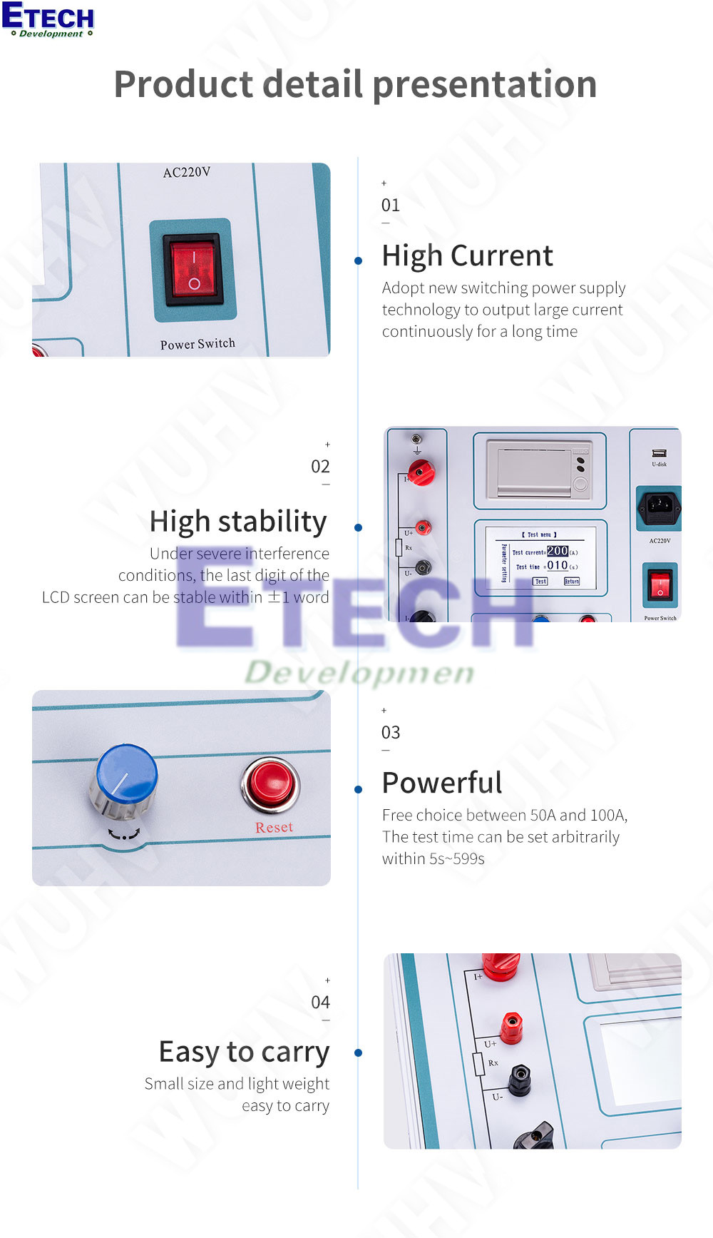 Tính năng mạnh mẽ: Tùy chọn dòng đo linh hoạt 50A hoặc 100A. Thời gian kiểm tra có thể cài đặt tự động trong khoảng từ 5s đến 599s, khắc phục được nhược điểm không cài đặt được thời gian hoặc thời gian làm việc liên tục quá ngắn của các máy cùng loại khác, vượt xa về hiệu năng.