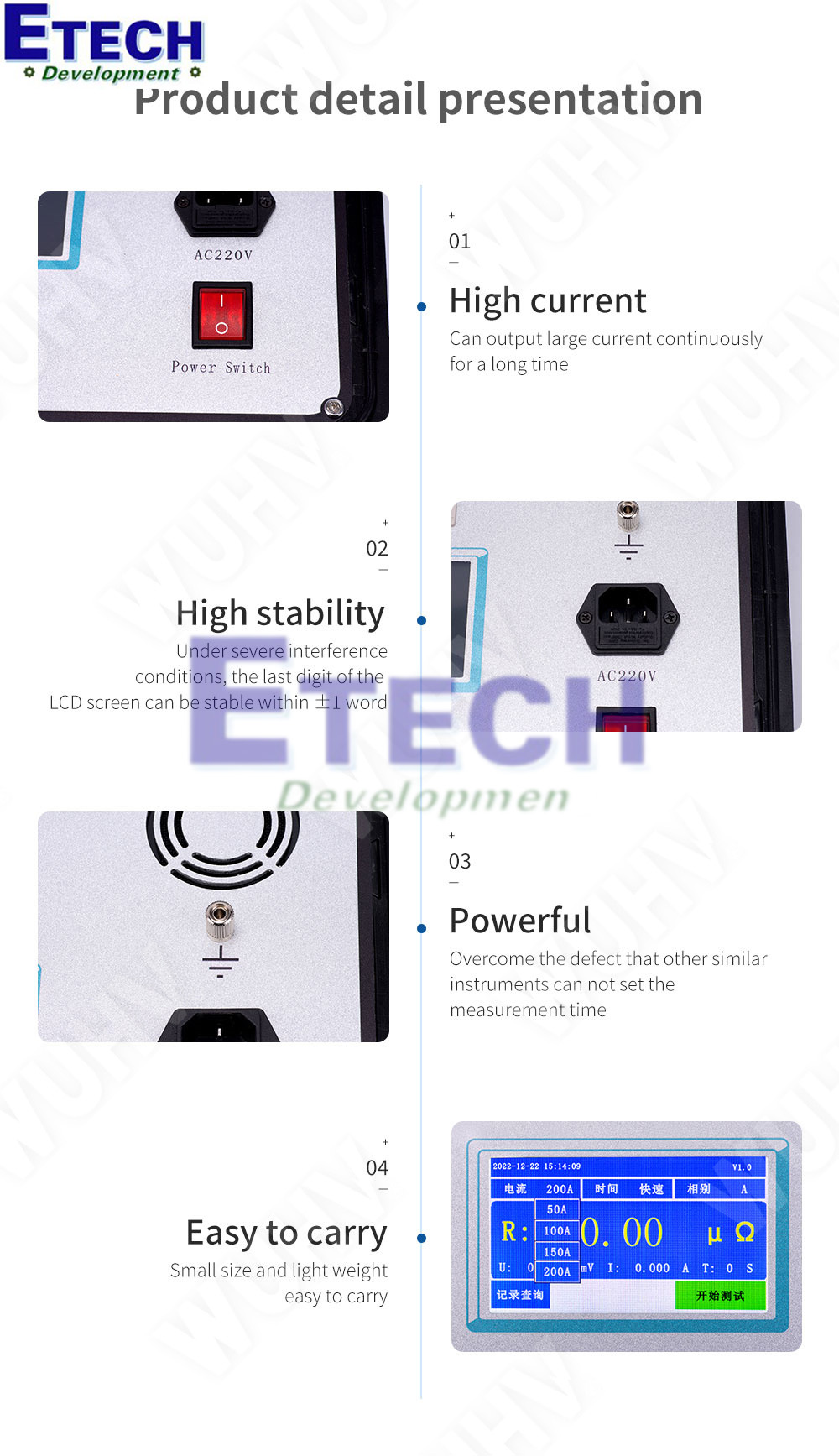 - Đa dạng chế độ đo mạnh mẽ Dòng thử nghiệm tùy chọn: 50A, 100A, 150A, 200A Thời gian đo tùy chọn: nhanh (vài giây), 10s, 30s, 60s hoặc tùy chỉnh – vượt xa các thiết bị cùng loại trên thị trường.