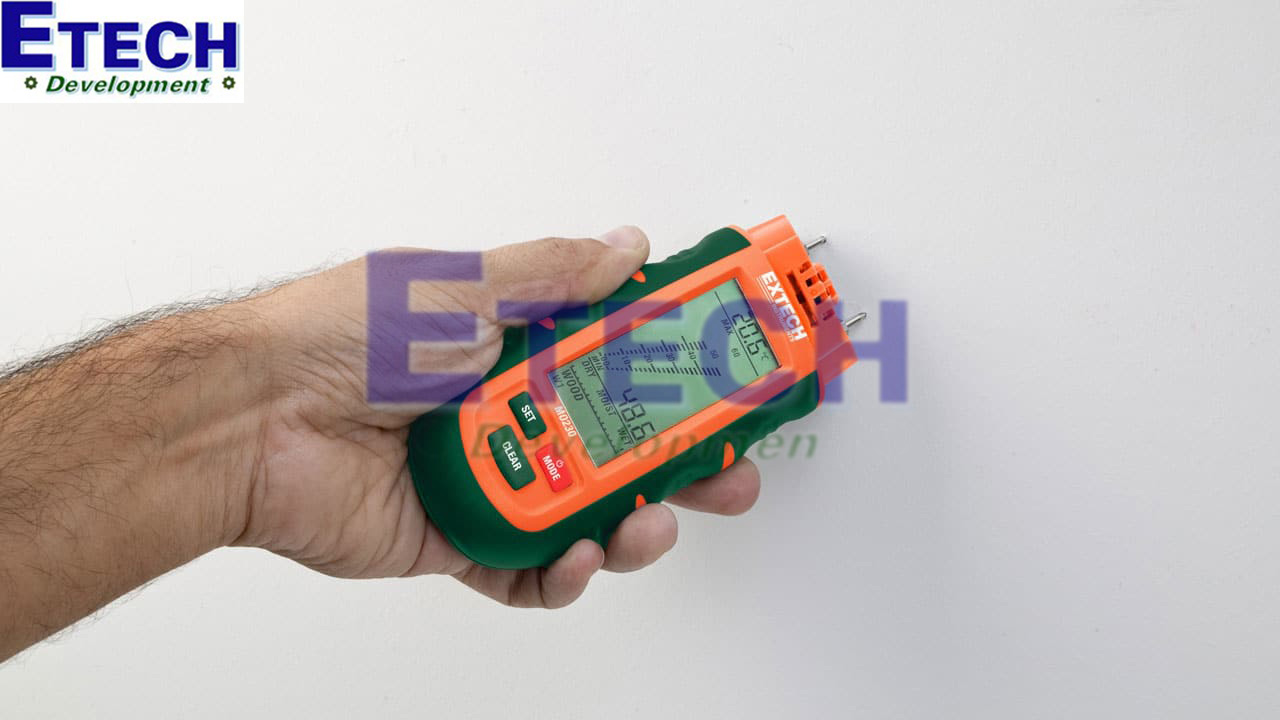 - Phát hiện sự cố liên quan đến độ ẩm: Máy đo độ ẩm Extech MO230 được sử dụng để phát hiện các khu vực bị thấm nước, rò rỉ hoặc ẩm ướt, giúp ngăn ngừa các vấn đề nghiêm trọng như ẩm mốc và hư hỏng cấu trúc.