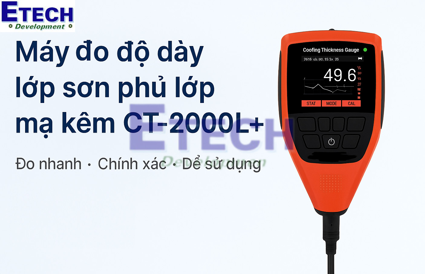 Với trọng lượng chỉ 137gvà kích thước cầm tay, CT-2000L+ dễ dàng mang theo đến công trường hoặc xưởng sản xuất. Giao diện menu đơn giản, hỗ trợ tiếng Anh/Việt, cho phép điều chỉnh thông số nhanh chóng như giới hạn đo, đơn vị (μm/mils/mm) và chế độ thống kê (trung bình, max/min, độ lệch chuẩn). Màn hình LCD lớn hiển thị rõ ràng ngay cả dưới ánh sáng mạnh, phù hợp cho người dùng mới.