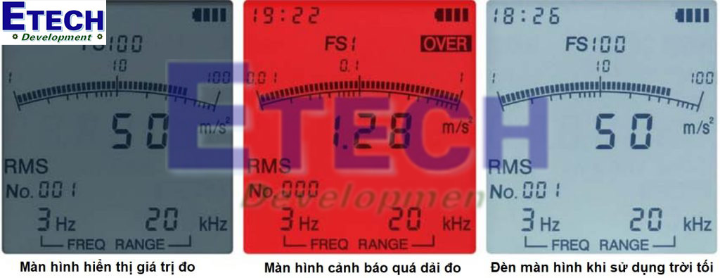 | Chỉ báo chế độ đo | Gia tốc, Vận tốc, Dịch chuyểnChỉ báo địa chỉ bộ nhớ: 000 đến 999 (1 000 dữ liệu) |