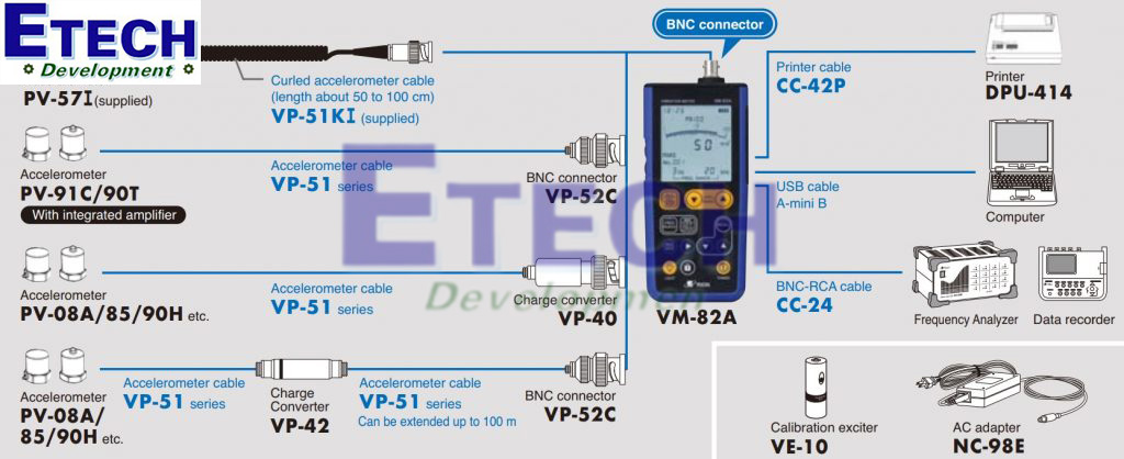 | Độ chính xác tổng thể (kết hợp với PV-57I) | Gia tốc : Phạm vi toàn thang đo ±5 % (80 Hz) Vận tốc : Phạm vi toàn thang đo ±8 % (80 Hz) Dịch chuyển : Phạm vi toàn thang đo ±10 % (80 Hz) |