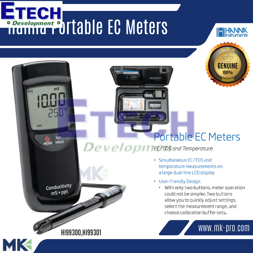 HI99301 là một máy đo EC/TDS và nhiệt độ cầm tay được cung cấp với một đầu dò độ dẫn hai vòng cho phép đo trong thang đo EC thấp từ 0.00 đến 20.00 mS/cm và TDS từ 0.00 đến 10.00 ppt. Tất cả các giá trị đều được bù nhiệt tự động (ATC) và người sử dụng có thể điều chỉnh hệ số nhiệt độ và hệ số TDS để phép đo được bù chính xác.