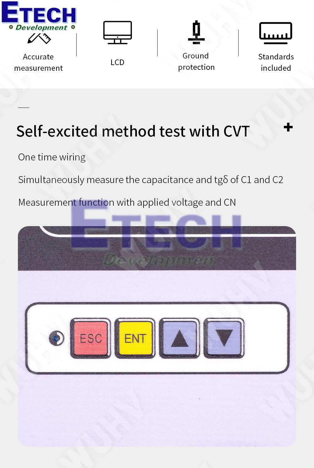 - Đo được cả thiết bị không nối đất và có nối đất theo phương pháp đấu dương/ngược; đồng thời đo tan δ của CVT và điện dung C1, C2 riêng biệt.