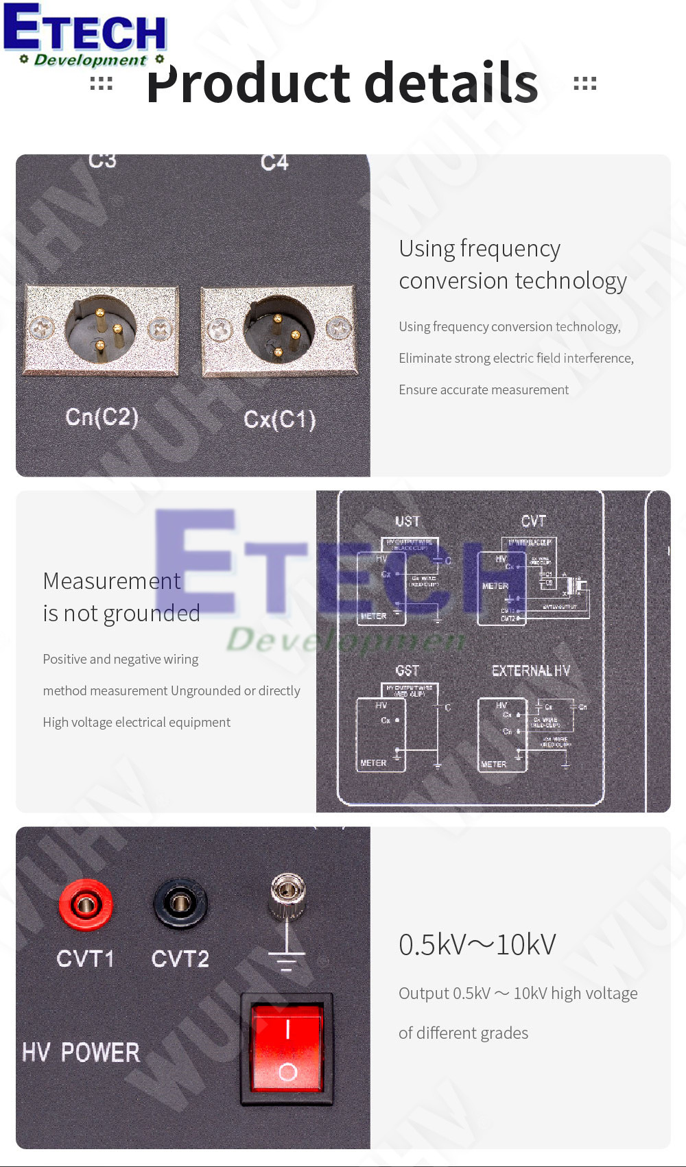 UHV-341 hỗ trợ đo cả thiết bị không nối đất và có nối đất theo phương pháp UST và GST, đồng thời đo được hệ số tổn hao của tụ điện áp máy biến điện áp (CVT) và điện dung riêng của tụ chính C1, C2.
