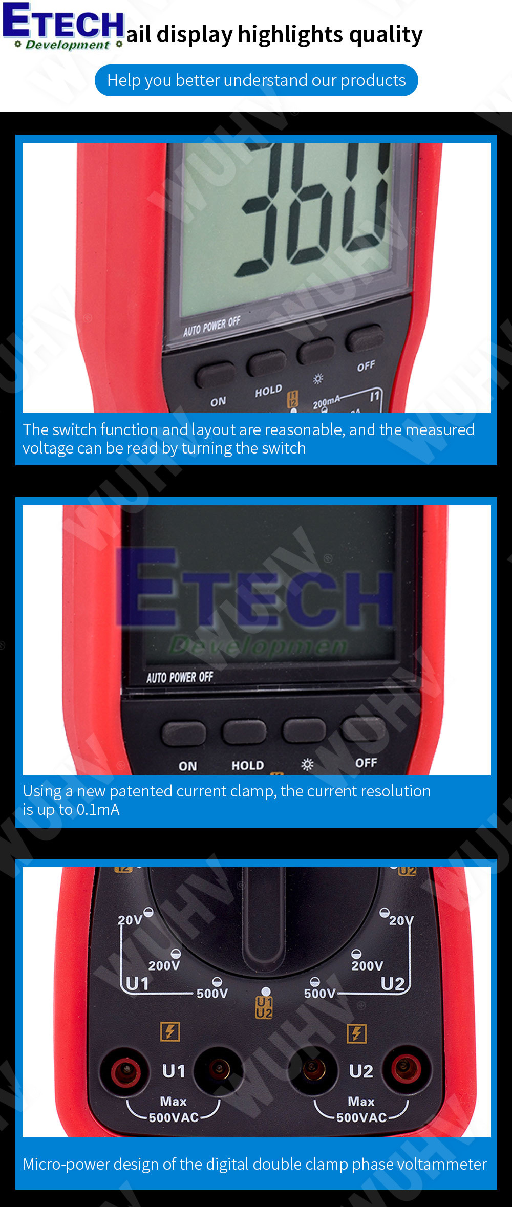 - Kẹp dòng công nghệ mới (đã đăng ký sáng chế): Độ phân giải dòng điện cực cao: 0.1mA, Độ phân giải điện áp: 0.1V