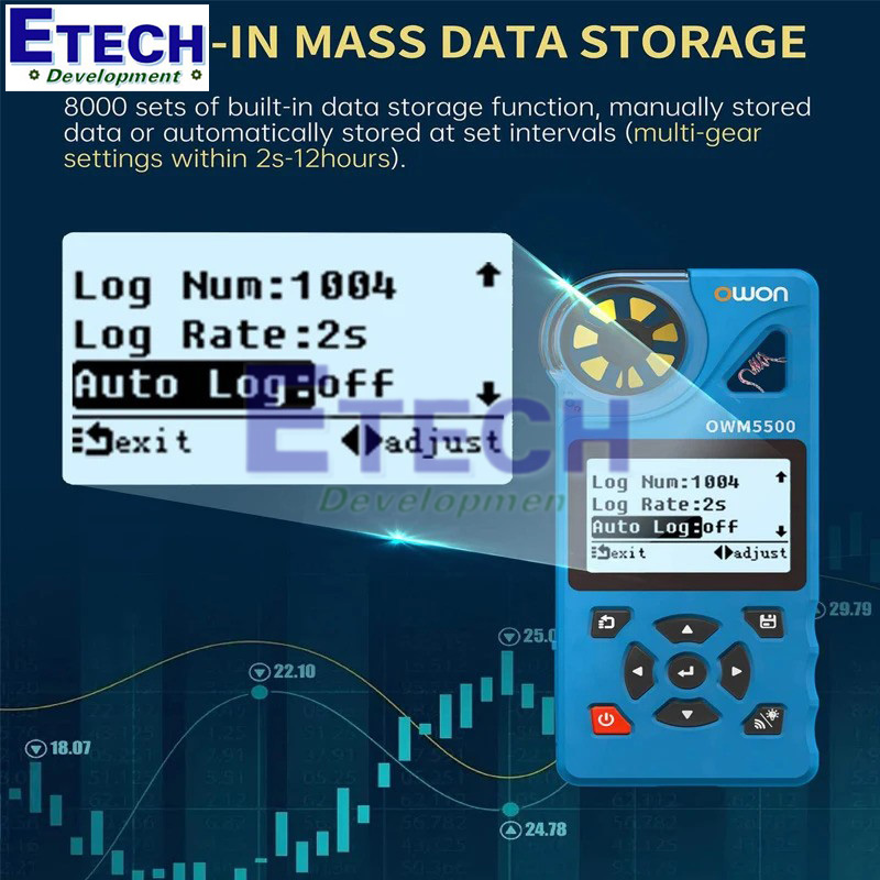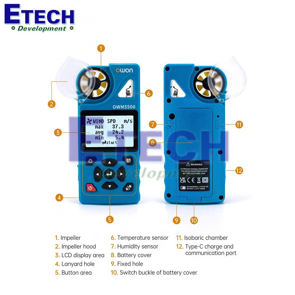Máy đo tốc độ, lưu lượng gió, nhiệt độ, độ ẩm, điểm sương OWON OWM5500 là giải pháp đo lường toàn diện, lý tưởng cho nhiều ứng dụng công nghiệp, xây dựng và nghiên cứu môi trường. Với độ chính xác cao, thiết kế tiện dụng và khả năng đo lường đa chức năng, OWON OWM5500 đáp ứng tốt nhu cầu của người dùng và mang lại nhiều lợi ích trong việc giám sát và kiểm tra các thông số môi trường. Hãy liên hệ với Etech Việt Nam để được tư vấn và hỗ trợ mua hàng tốt nhất.