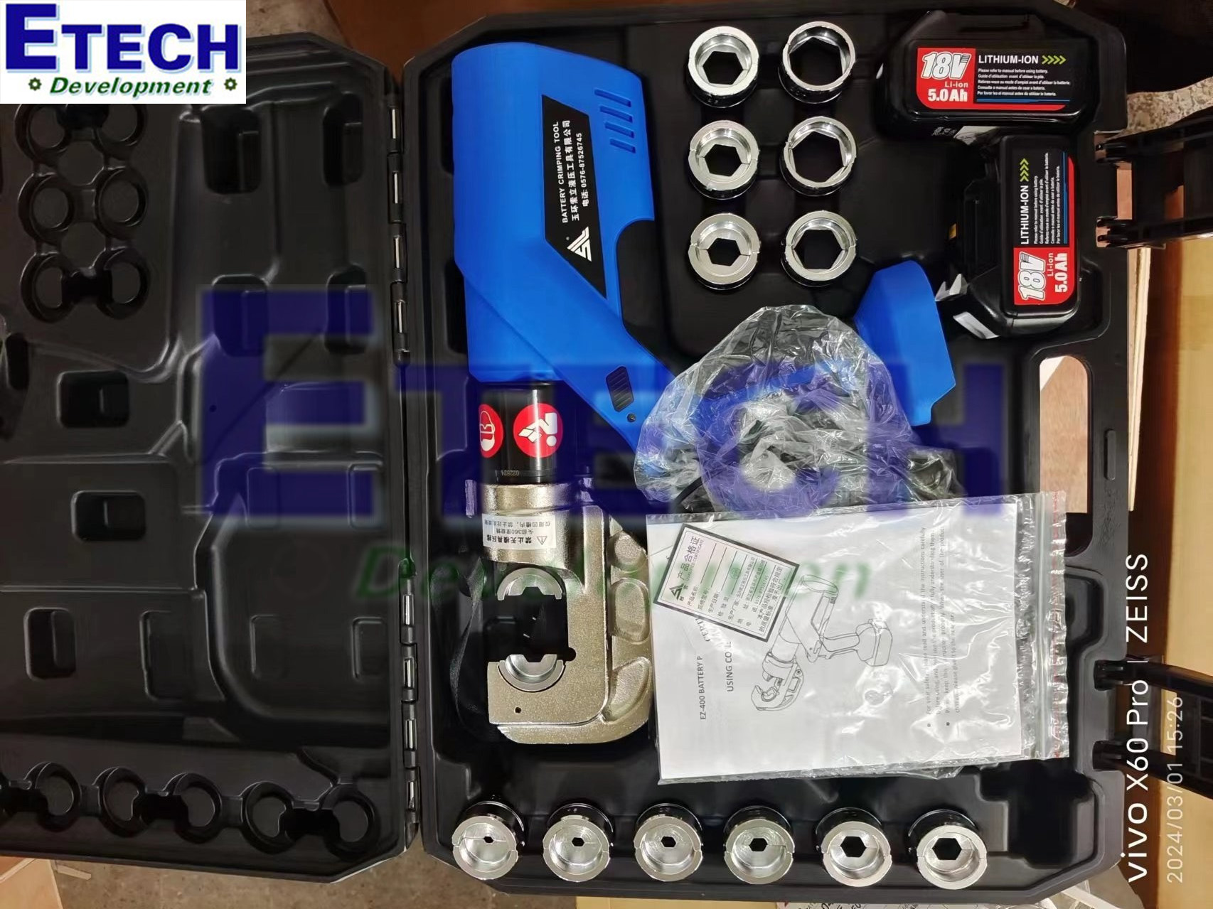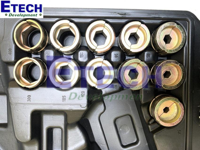 Sản phẩm không chỉ đơn thuần là một máy ép cos thủy lực mà còn đi kèm với đầy đủ phụ kiện, bao gồm 2 pin 18V, 1 chân đế sạc và một loạt các đầu cos với kích thước từ 16 đến 400mm2.