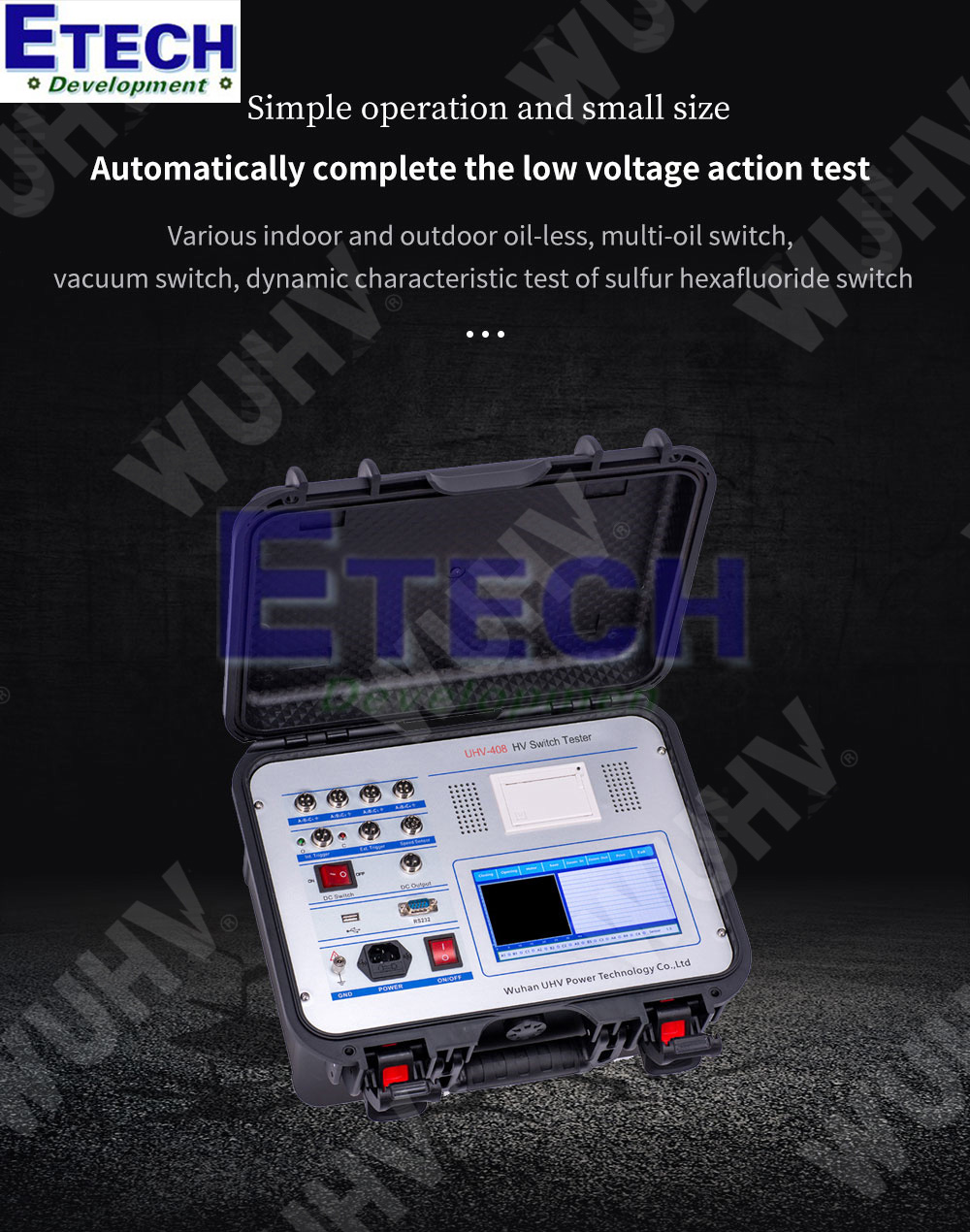 UHV-408 có thể kiểm tra đặc tính động cơ học của nhiều cấp điện áp và nhiều loại máy cắt khác nhau như: máy cắt ít dầu, nhiều dầu, chân không và SF6, giúp hỗ trợ tối đa việc phân tích, đánh giá và bảo trì thiết bị.