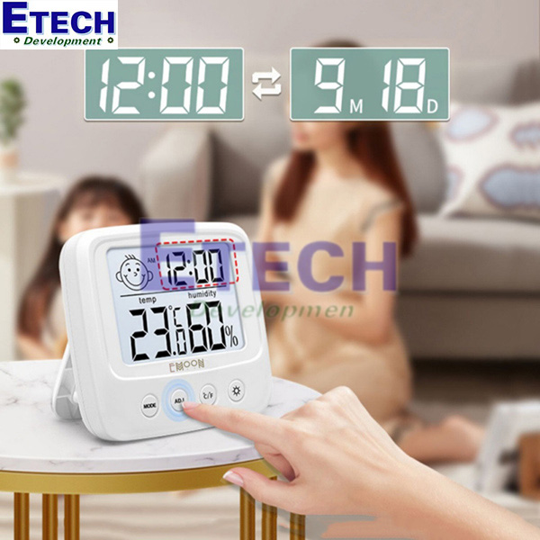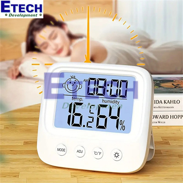 - Đo độ ẩm từ 20%RH đến 90%RH, tích hợp đồng hồ, lịch và báo thức.