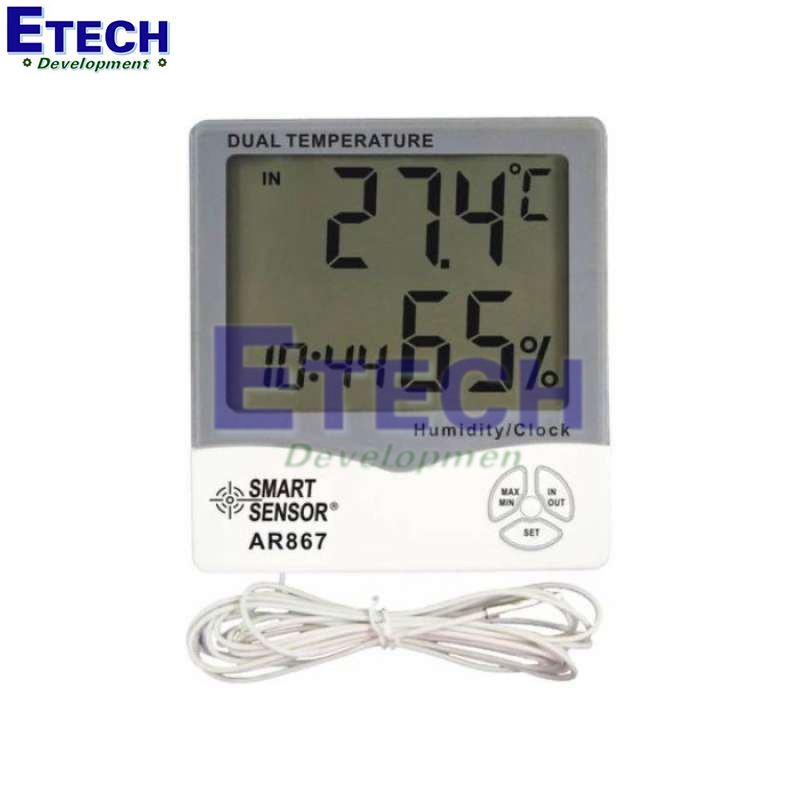 SMARTSENSOR AR867 đo nhiệt độ phòng từ -10°C đến 50°C (sai số ±1°C) và độ ẩm từ 20%RH đến 90%RH (sai số ±5%RH), cung cấp kết quả chính xác khi đặt trong không gian cần kiểm tra. Ngoài ra, nó còn tích hợp đồng hồ, lịch, báo thức và đo nhiệt độ ngoài trời (-50°C đến 70°C) qua cảm biến phụ, là lựa chọn tiện lợi, giá hợp lý 315.000 để quản lý môi trường sống.