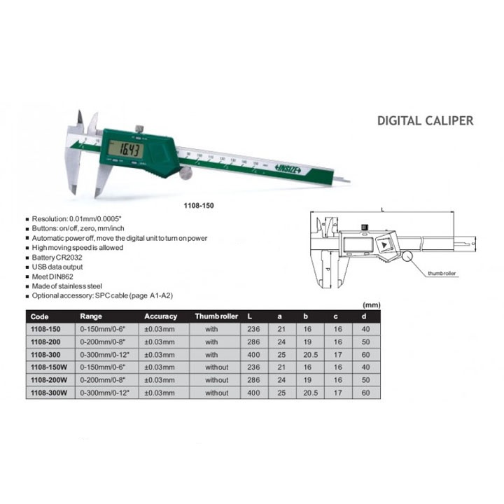 - Thước cặp điện tử Insize có model 1108-150 được sử dụng bằng pinCR2032 thuận tiện cho việc di chuyển nên có tính di động cao.
