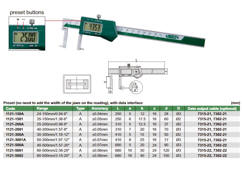 Thước cặp điện tử đo rãnh trong INSIZE 1121-5002 (80-500mm/3.15-20 inch)