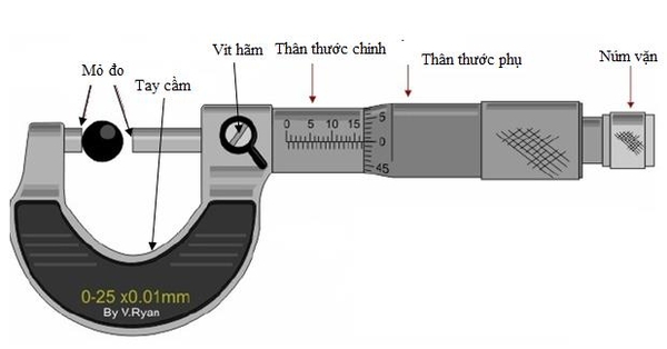 Hình ảnh dưới đây minh họa chi tiết và có thể giúp các bạn hiểu được hơn về cấu tạo Panme: